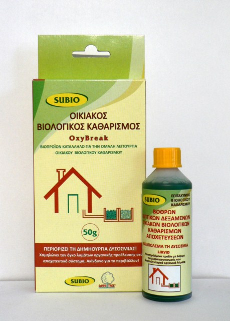 02 OxyBreak - Είναι βιολογικό προϊόν κατάλληλο για οικιακό βιολογικό καθαρισμό. Το προϊόν επιταχύνει σημαντικά τη διάσπαση της οργανικής μάζας (καθώς και το χαρτί υγείας), μειώνει τον όγκο των λυμάτων. Εξαφανίζει τη δυσοσμία. Η ιδιότητά του, να καταπολεμά τα αρνητικά χαρακτηριστικά του λίπους εμποδίζει το άφρισμα και έτσι ο οικιακός βιολογικός καθαρισμός λειτουργεί χωρίς προβλήματα.Το περιεχόμενο της συσκευασίας είναι η αρχική δόση για τον οικιακό βιολογικό καθαρισμό χωρητικότητας 4-10 ατόμων. Τους επόμενους μήνες η δοσολογία μειώνεται στη δόση συντήρησης που είναι ένα κουτάλι της σούπας τον μήνα.